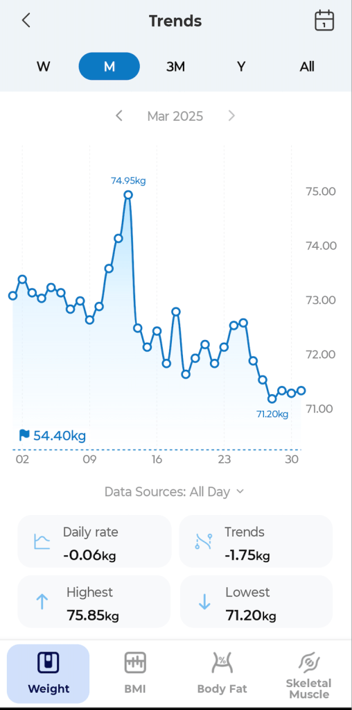 At the beginning of April, I weighed 72.6 kg. As of today, I weigh 68.95 kg. While the number isn’t everything, it does make me feel lighter. That said, I also think my March exercise habit contributed to this. Although I wasn’t very consistent with exercise this month (I missed about 10 days in a row), it still played a part. Honestly, I felt like I was self-sabotaging my own progress. My journaling also took a hit; I skipped a few days. But I stayed consistent with eating breakfast most mornings, which I’m proud of.